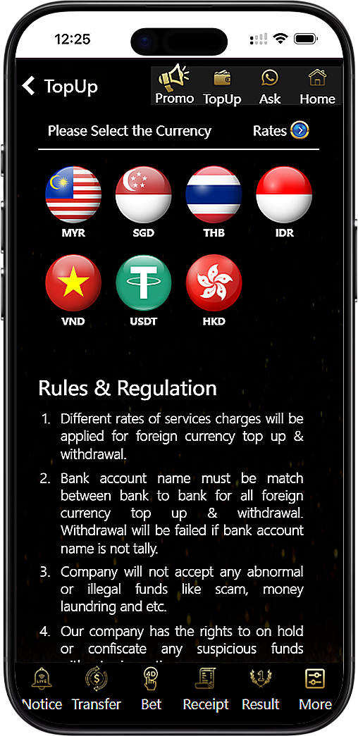 Enjoy fast, secure, and verified top ups through FPX, QR Pay, or e-wallets. Choose your preferred currency and fund your account instantly.